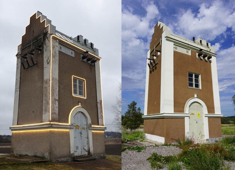 Sipoon tornimuuntaja ennen remonttia ja remontin jälkeen.