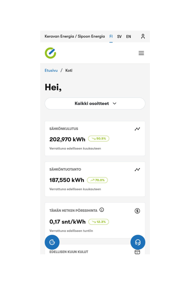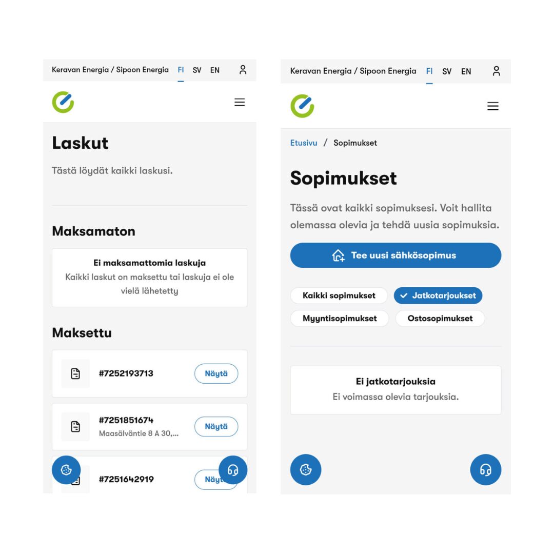 Kokonaan uusitussa asiakasportaalissamme voit tarkastella sopimuksiasi ja laskujasi tai vaikka tehdä uusia sopimuksia kanssamme. Lisäksi näet tietoa kulutuksestasi sekä voit seurata pörssisähkön hintaa.