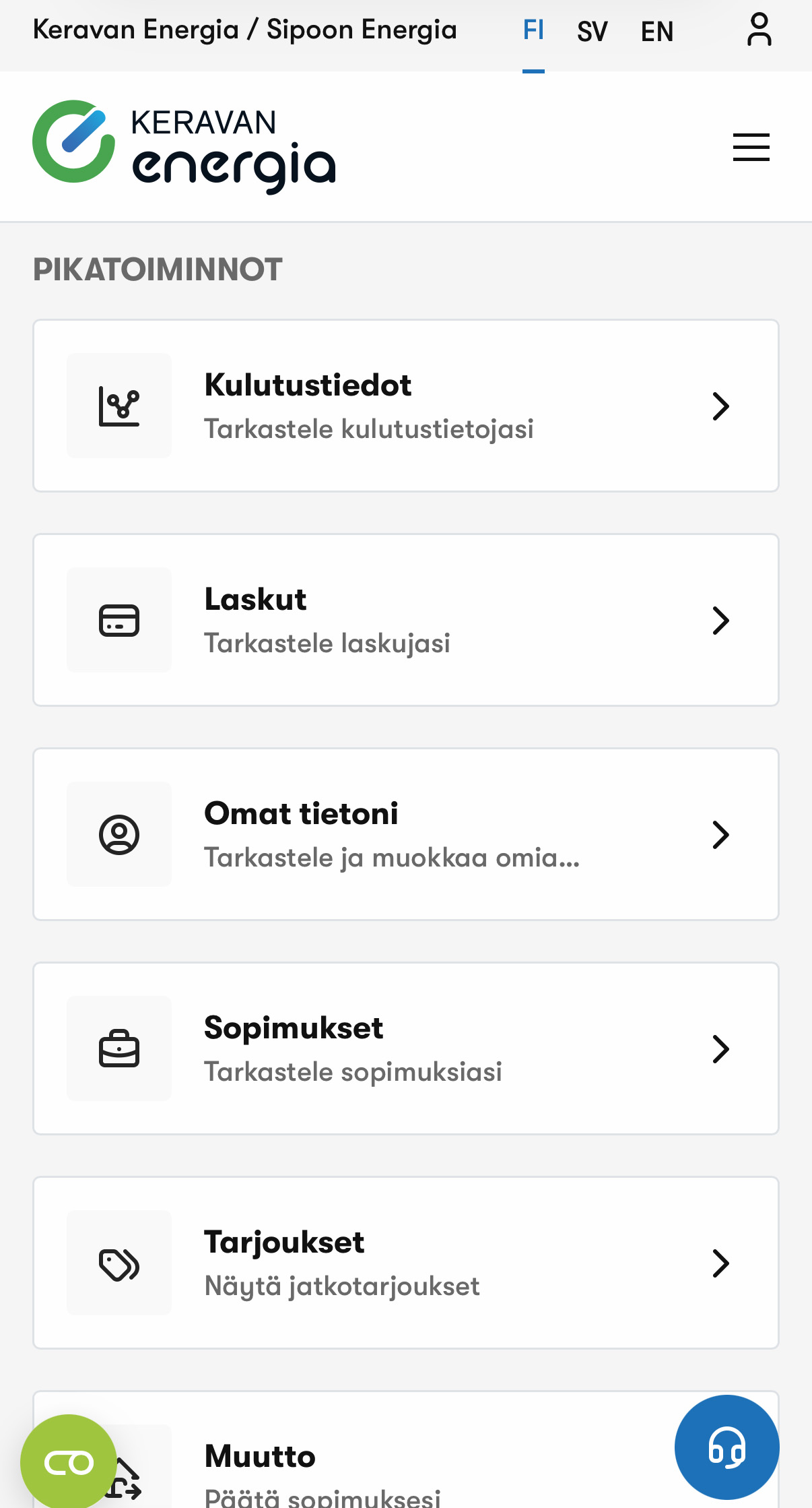 - Sopimustiedot, mm. sähkö-, verkko- ja kaukolämpösopimus
