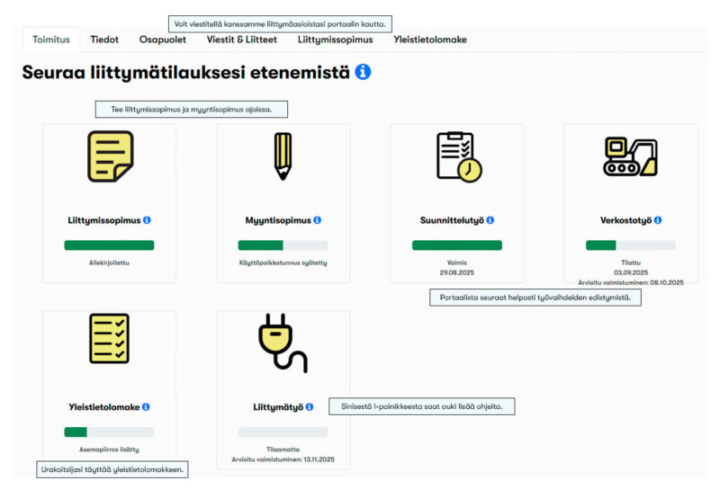 OmaLiittymä är vår smidiga onlineportal där du enkelt kan beställa en ny elanslutning, göra ändringar i en befintlig anslutning och följa hur ditt ärende framskrider. Du kan också kommunicera direkt med oss om allt som rör elanslutningar – när det passar dig.