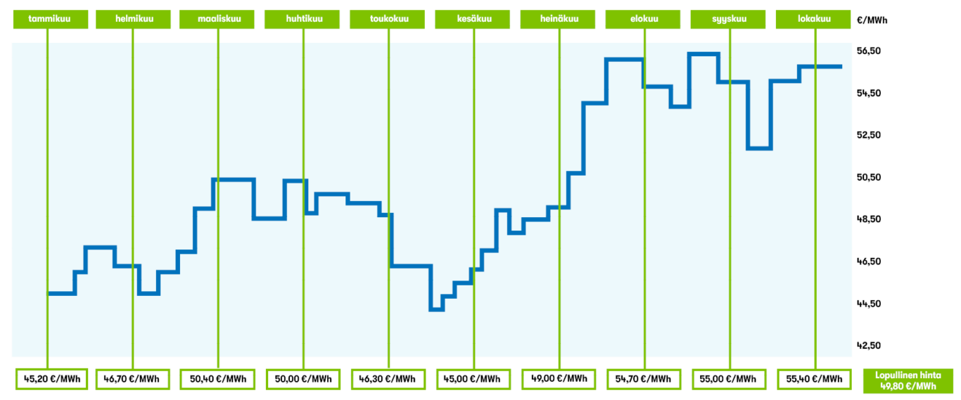 Tällä hetkellä Kiinnityssähkö-sopimuksemme on Kiinnitys10, missä sähkön hinta kiinnitetään kuukausittain kymmenessä erässä alkaen tammikuusta. Kiinnitys tehdään aina kunkin kuukauden kymmenes päivä. Lokakuussa seuraavan vuoden hinta on määritelty ja sähkön hinnaksi muodostuu kiinnitysten keskiarvo. Asiakas saa raportin tehdyistä kiinnityksistä säännöllisesti.